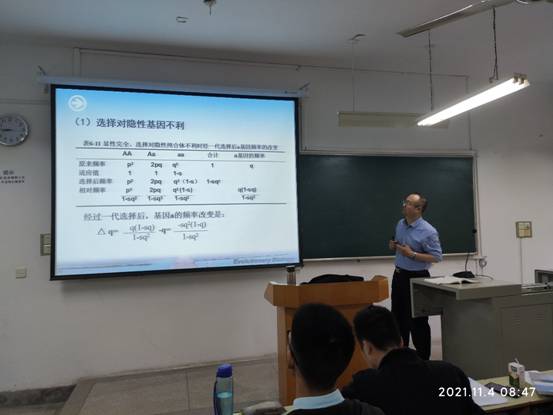 11月4日上午,生物工程系组织教师观摩由代江红老师主讲的《生物进化论》思政公开课。本次课的主要内容是影响基因频率改变的因素,包括突变、迁移、遗传漂变和自然选择。